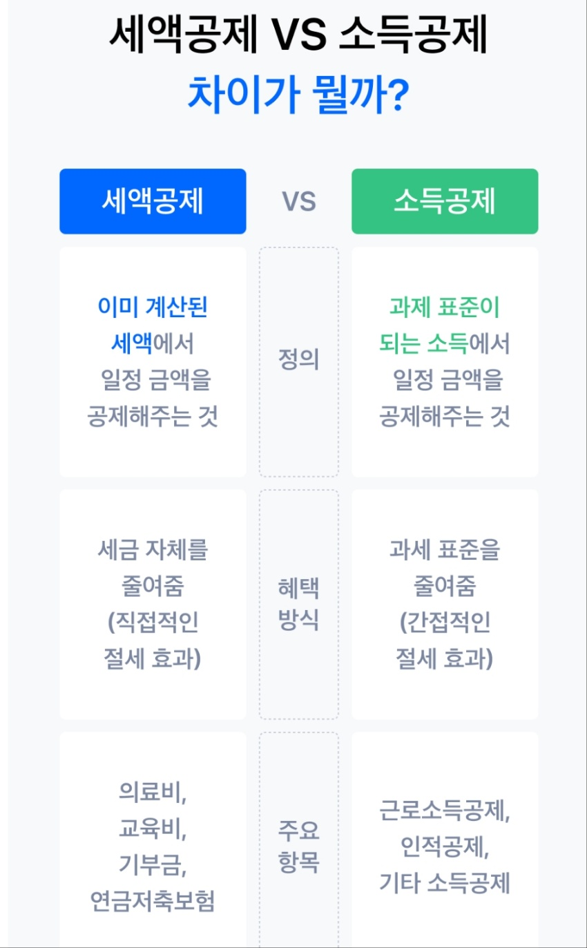 4. 세액공제 정의 : 산출된 세액에서 일정 금액을 직접 공제하여 세금을 경감하는 항목입니다. 효과: 세금을 직접적으로 줄여주기 때문에 절세 효과가 큽니다. 대표항목 – 자녀 세액공제 – 연금계좌 세액공제 – 의료비, 교육비, 기부금 세액공제세액공제는 산출세액에서 공제되므로 납부세액을 직접적으로 줄여줍니다. 소득 공제와 세금 공제의 차이점
